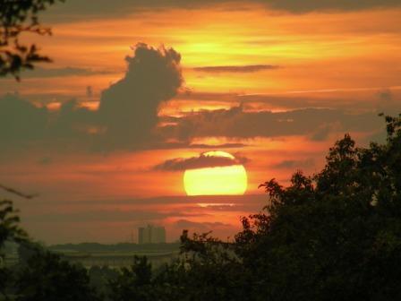 Viele Staubpartikel sind in der Luft. Die Sonne erscheint aufgrund des größeren Abstandes zum Betrachter rötlich.